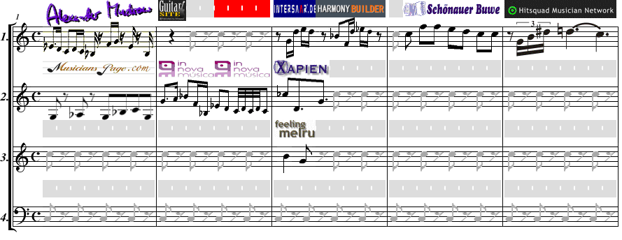 Composers, musicians, songwriters, DJ's, companies in the marketplace of music production who want to increase their website traffic, e.g. publishing companies, musical instrument producers, etc. (but not only limited to these!): Own a Note of Internet Music History by downloading of the current demo MIDI file, import of this file into almost any music composition software, creative composition of your musical phrase, conversion of your music contribution into notation (please add your notes into the templates I provide, see below), and placing of a click-through banner advertisement (e.g. your logo) above your notes. For details about the Million Dollar Music Composition see FAQ (Frequently Asked Questions) and Buy Notes subpages. For your convenience please generate your music note images by downloading and modifying the correctly sized Music Note Image Templates (click here). Recently we have established a new service: We provide a listing of International Songwriting and Composers' Competitions and Contests.